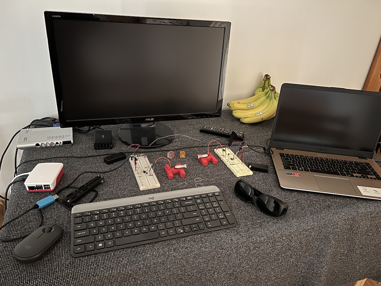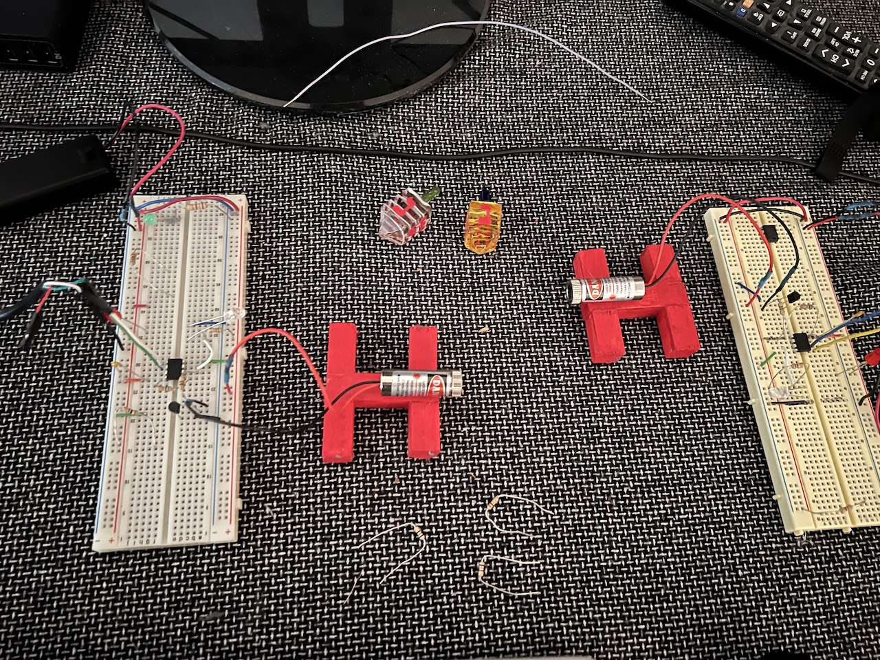 Pictures Above is a close up picture of the two circuits and the two lasers. Each circuit runs on 3v of battery which was nice since the battery holders had on/off switches. This allowed me to turn the lasers off if I needed to make some code changes. And this is bigger picture. Between the two computers are the laser saftey goggles I used for eye protection. Source Code https://github.com/mikeakohn/small_projects/tree/main/ip_over_lasers