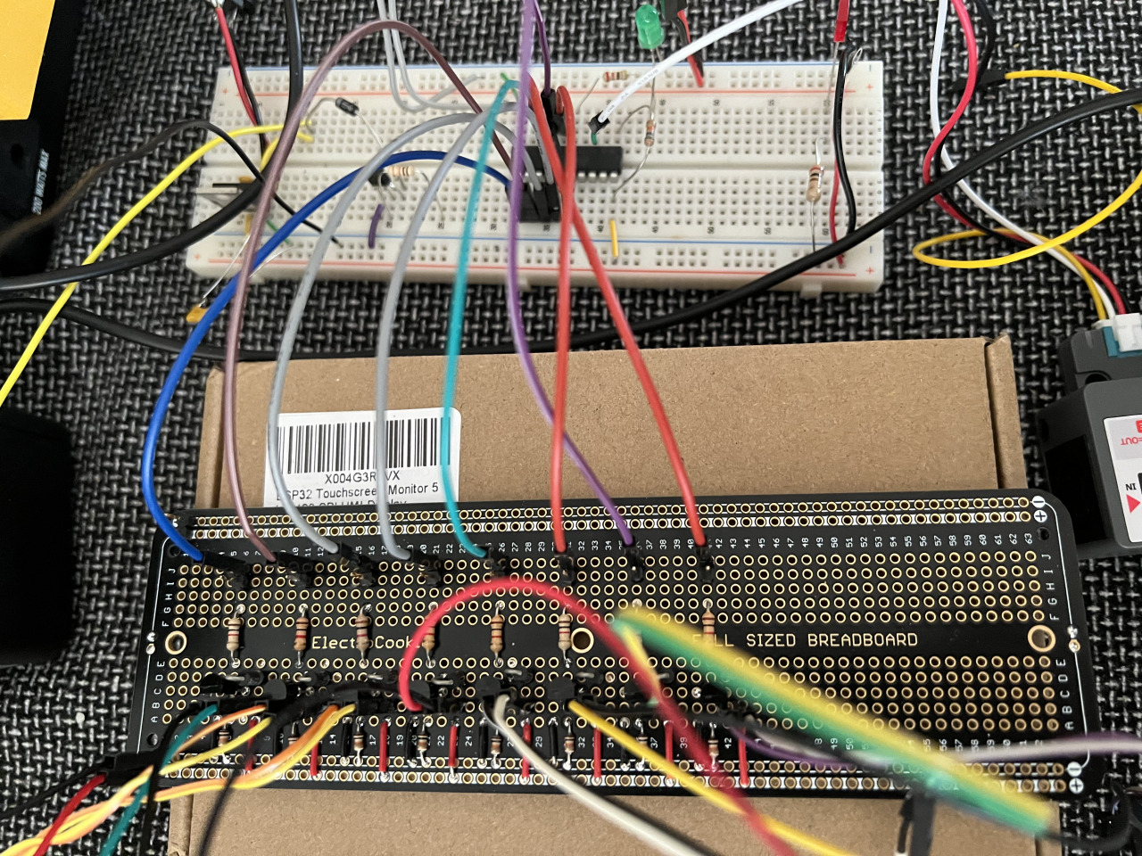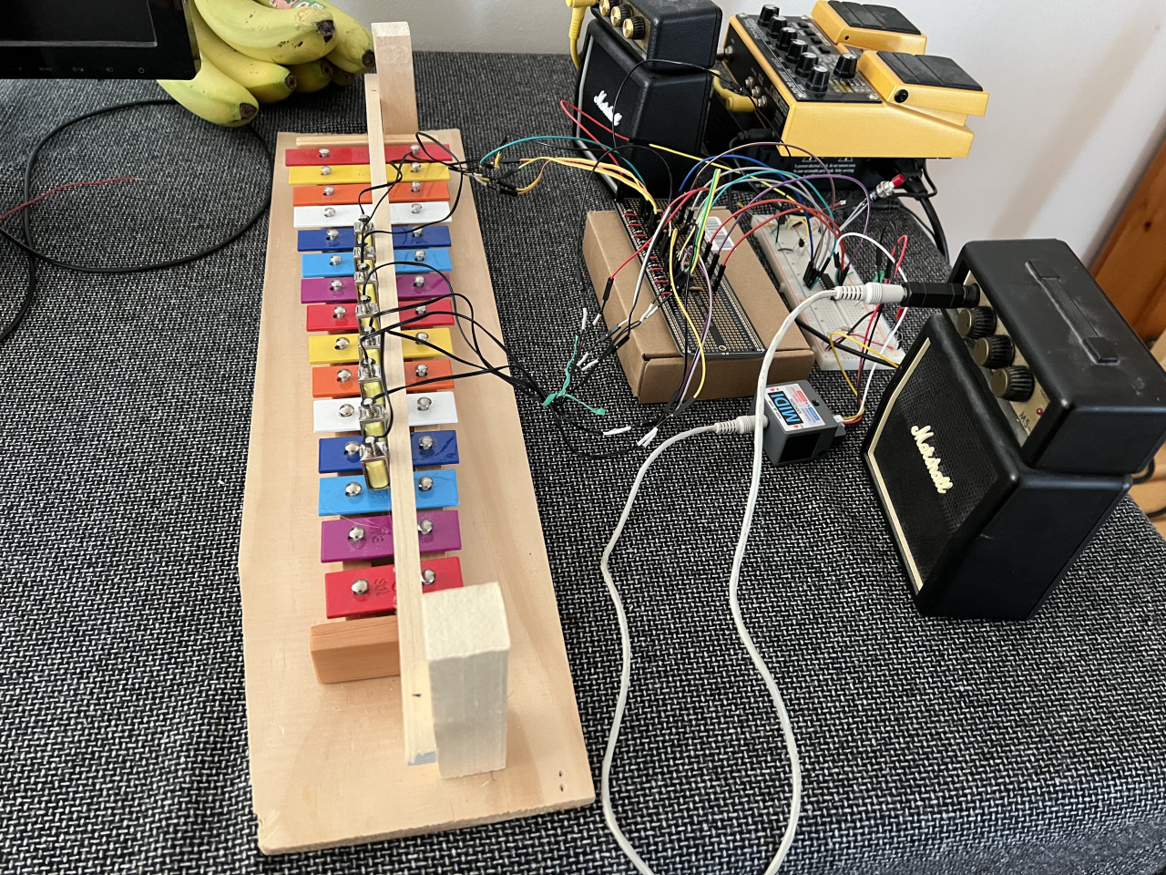 Solenoid MusicPosted: June 8, 2022 Introduction This is a set of projects that use solenoids to smack things to make music. The first project uses a set of glasses filled with different levels of water to make different tones. The second is the same solenoids hitting keys on a xylophone. Below are the videos for the projects and longer explanations of what was done to make these projects work, including source code. Video The video shows 7 of the 8 glasses / solenoids with the 8th on the far right and out of the video. The solenoids are glued to a wooden bar on the main board to raise them so they hit closer to the middle of the glass. The sound is captured just by the microphone on the camera and even the bass guitar isn't hooked up to an amplifier, so it's a little quiet. Oddly, this is the song that made me get a guitar.. and instead of playing guitar here I'm playing bass. YouTube: https://youtu.be/2_NfvhZ4FB4 Above is the xylophone + solenoids video. The xylophone is a ... $10 or so more or less toy ... with 8 solenoids. The guitar is an old Fender Squier II that I scalloped and put DiMarzio HS-3 pickups in. For distortion a Boss OD-20 in MT-2 zone mode was used (for obvious reasons) connected to a Mini-Mashall amp. The output level of the OD-20 and volume on the Marshall was kept quite low to try to make the xylophone more "forward" in the mix... it usually has a better, more crunchy sound do it. The M5Stack MIDI module is hooked up to another Mini-Marshall. YouTube: https://www.youtube.com/watch?v=yR54dgWze1MWater Glasses The first project uses different sized glasses of water to create different tones. I found a set of 5 super cheap solenoids on Amazon and got two of them so there could be a total of 10 tones. It turns out the intro to Guns N' Roses Sweet Child O' Mine only requires 8 tones, so I built a circuit and programmed an MSP430G2553 to trigger the solenoids. The source code is written in Java and compiles / assembles with Java Grinder and naken_asm. There is a link to the source code at the bottom of the page. The most tedious part of this project was the physical setup. For every solenoid there needs to be a PN2222 transistor, 2 resistors, one kickback diode, and wires connecting to the MSP430 and to the solenoid. Since I had 10 solenoids, I decided to make 10 of these little circuits, but in the end only 8 were actually needed. For the solenoids, normally each one could cost at minimum $10 each which would have made this an expensive project, but someone was selling sets of 5 of these for around the price 1. The comment on Amazon warned the buyer that these were pretty small and not very strong. For this project, totally perfect. A strong solenoid maybe could have broken the glass. These struck the glasses at the perfect strength to make it loud enough and not hurt anything. On top of the solenoid circuits being tedious, finding the right glasses to get the right tones was not fun. When going to Walmart and grocery stores, I was in the cooking and bottled drinks aisles tapping on all the glass looking like a jackass trying to find the right tones. Ended up getting a measuring cup and some expensive bottled waters that fit this project. Actually, the Whole Foods Organic Pink Grapefruit soda is quite good. The firmware on the microcontroller was written in Java, just because it made it a little easier than assembly language. Definitely makes the code easier to read, a lot more English-like. P2.0 to P2.5 are connected to the first 6 solenoids and P1.4 and P1.5 to the final 2. The code runs at ~2MHz and implements a TimerListener interface with a timerInterrupt() method that is called every 2000 CPU cycles. To delay in the main() code, a simple while loop waits until a certain number of interrupts fire. Xylophone After working with glass, it seemed like a xylophone project was needed. I found a super cheap xylophone on Amazon and made a wooden structure that could hold the same solenoids. This project not only has a xylophone, but an M5Stack MIDI module for the drums. That module runs at 5v so it seemed like switching to a Microchip (Atmel) ATtiny2313, which can run at 5v, would make sense. This time the code is written in assembly language. To do the drum sequence, Drums++ was used. To make it possible to have a melody for the solenoids, I added a "melody" feature to Drums++. The Drums++ source file dark.dpp contains the drum sequence and melody using the the new syntax. After being compiled by Drums++, a dark.mid file is generated. The .mid file is then converted into .json using parse_mid. A python script then reads in the .json file and builds a file called music.inc that contains the data in a format that a small music player on the chip can play. The music data plus the code to play the music fits in the ATtiny2313's code with about 200 bytes to spare. For the circuit, this time transistors were soldered. The transistors for this circuit are 2N7000 MOSFETs with 1k ohm on the gates. Unfortunately, I tried cutting a corner and left out the pull-down resistors on the gates but it did really funky stuff, so like previous circuit I put 10k ohm resistors from the gate to ground and the problem fixed itself. Above is the full setup showing the xylophone with solenoids, a Mini-Marshall guitar amp connected to a Boss OD-20 guitar pedal (and behind it a Boss Noise Reducer), an M5Stack MIDI module connected to another Mini-Marshall (for the drums), a circuit board full of transistors to drive the solenoids, and a breadboard containing the ATtiny2313 that plays the song by sending MIDI commands to the MIDI module, and pulses to the solenoids. Above is the circuitry for this project. Eight MOSFETs for eight solenoids and the Microchip (Atmel) ATtiny2313 that has the music and firmware stored in its 2k of flash memory. Above is a closeup of the solenoids hot-glued to the wooden structure that holds them above the xylophone. Source code